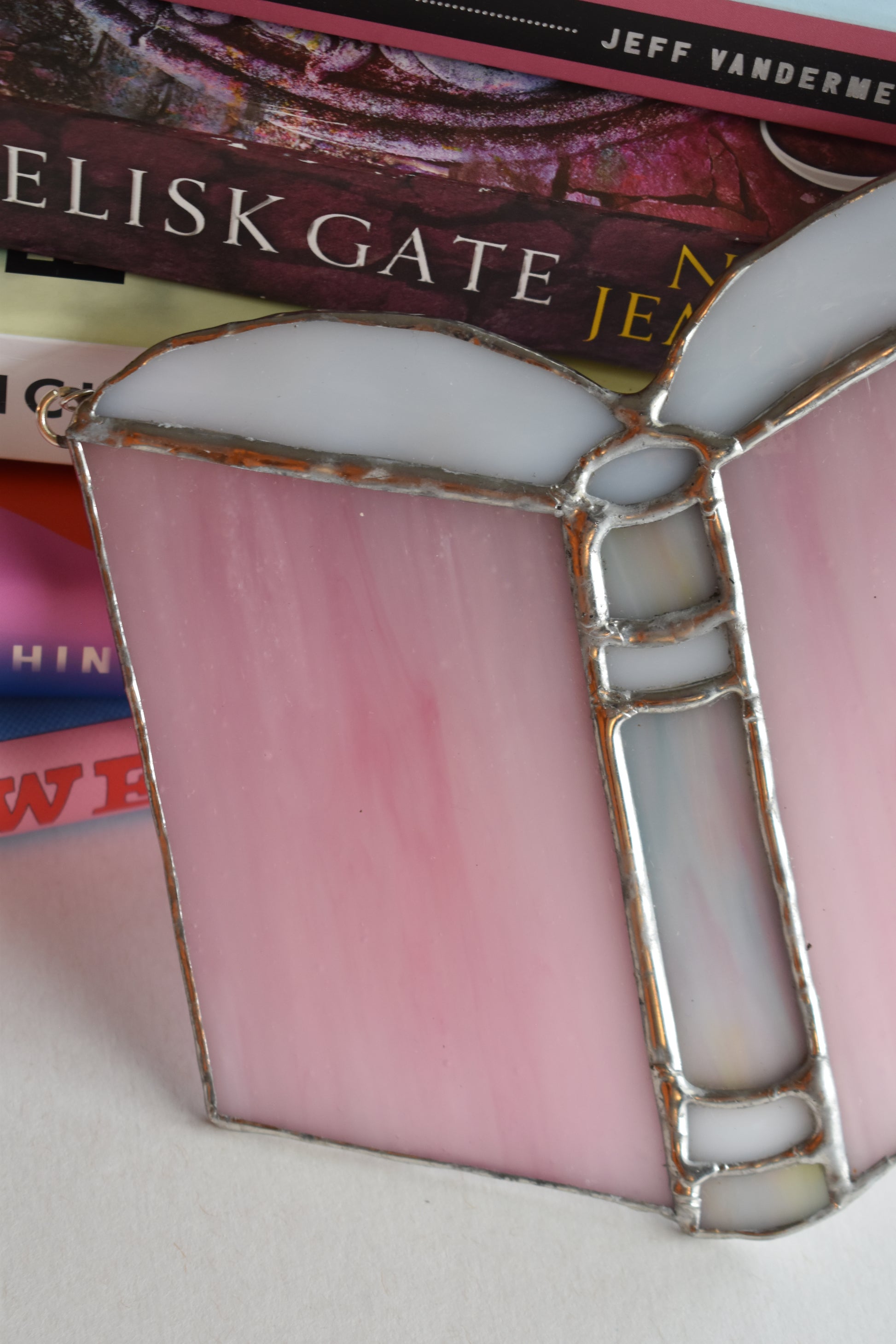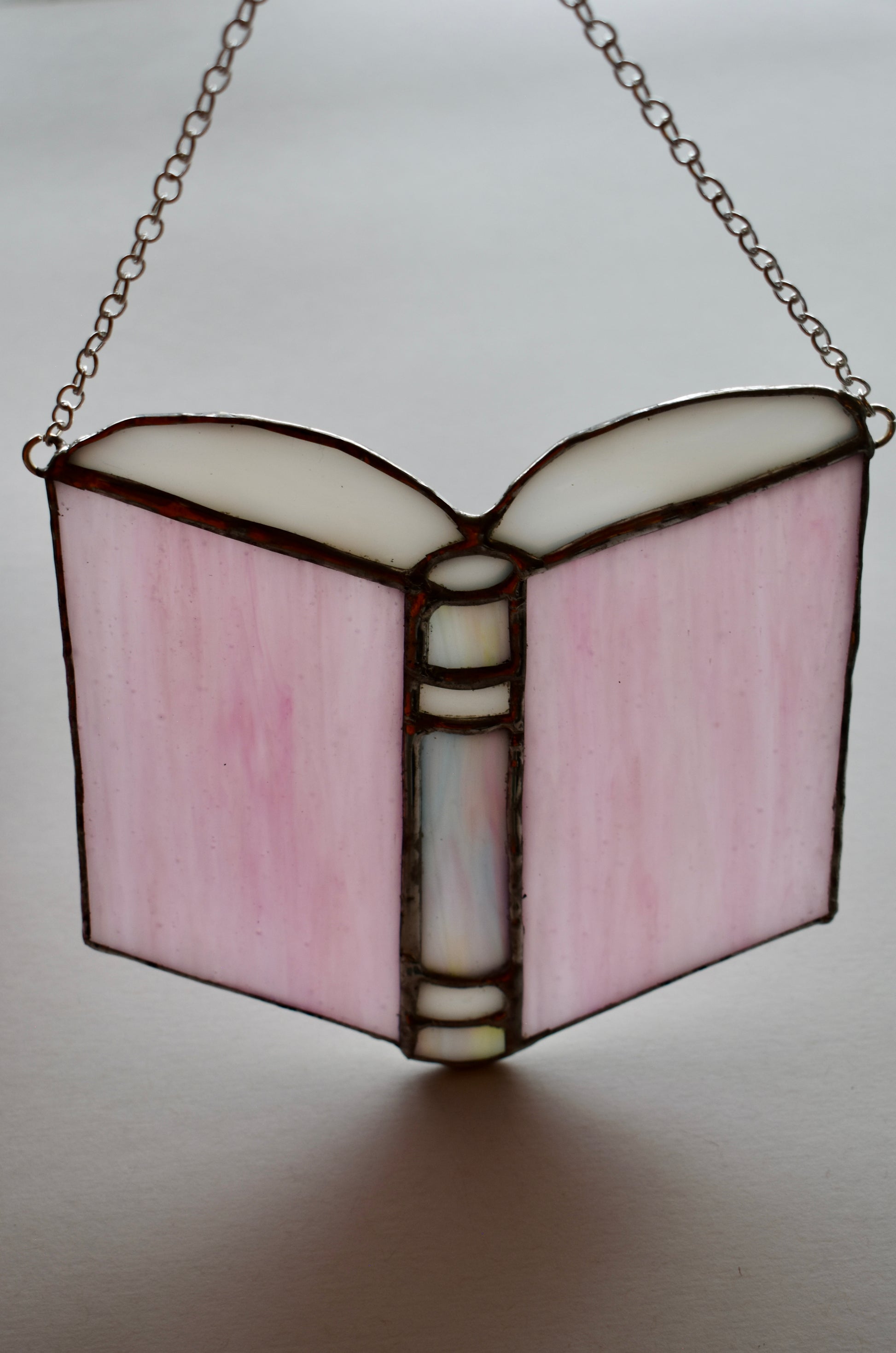 Celebrate your love of reading with this handcrafted stained glass piece shaped like an open book. The design features soft pink glass for the cover and crisp white glass for the pages, capturing a delicate, whimsical aesthetic that’s perfect for book lovers, home libraries, or cozy reading corners.