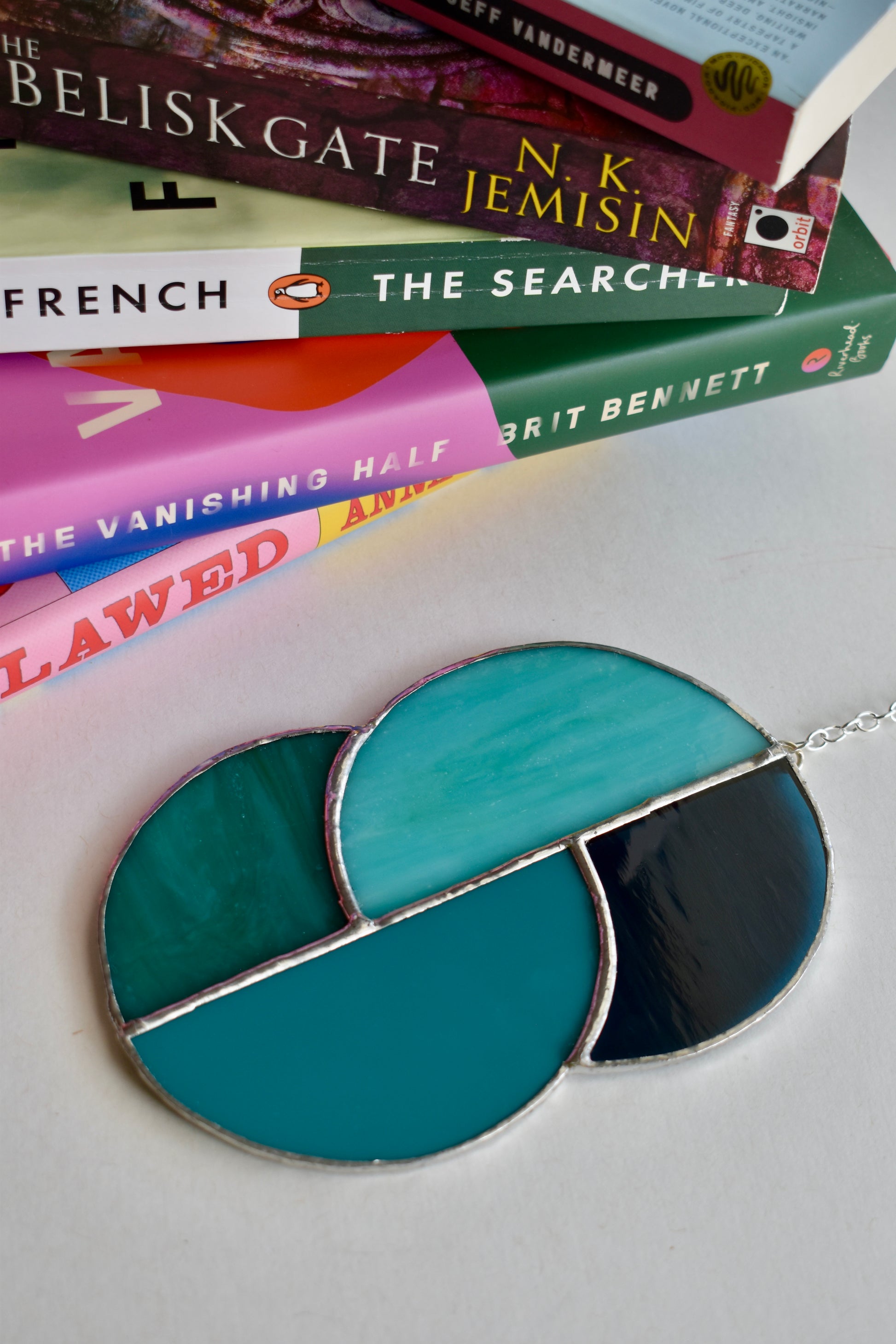 Add a refreshing pop of color to your home with this handcrafted stained glass sun catcher. Designed in a minimalist half-circle motif, it features vibrant shades of bright teal glass that feel both calming and energizing. When sunlight filters through, it casts luminous teal reflections that brighten your space with a cool, uplifting glow.